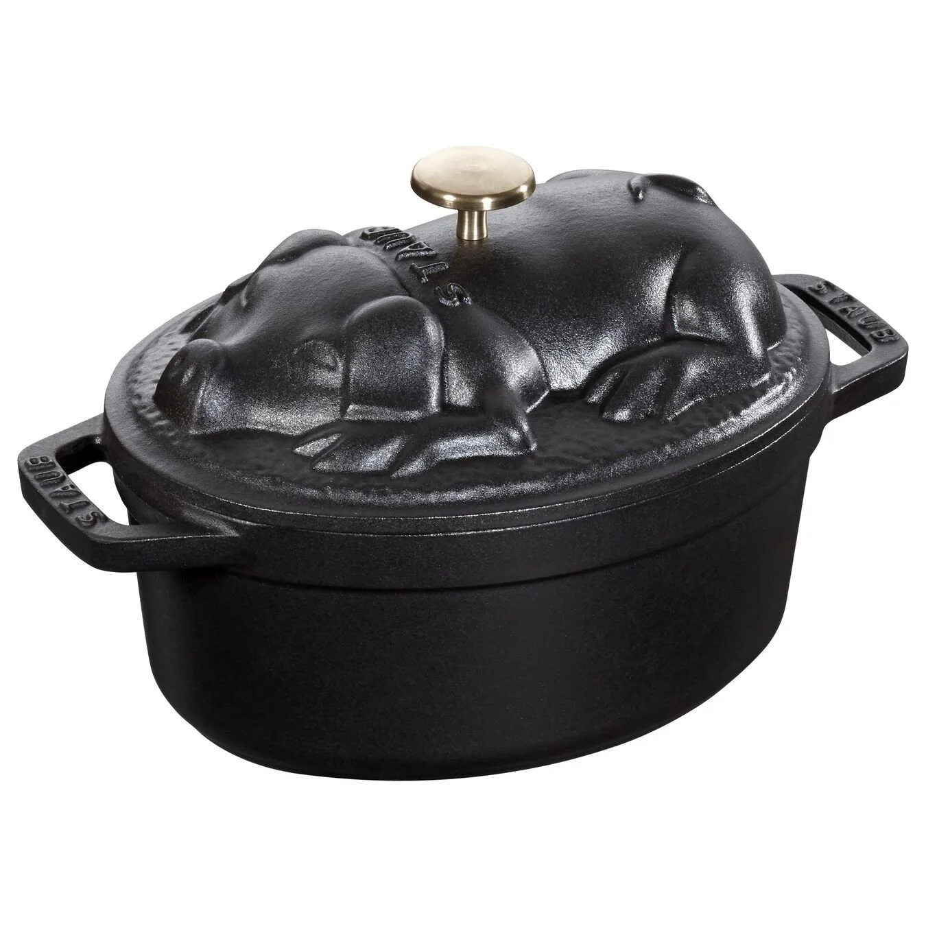 Cocotten blev oprindeligt designet som en gryde til braisering af kylling i det franske køkken. I denne dekorative cocotte, med støbejernslåg forestillende en liggende gris, vil du ikke blot være i stand til at tilberede en lækker coq au vin, men også et saftigt stykke gris med en perfekt sauce til. Støbejernscocotten fra Staub er en smuk stegegryde, som bestemt også bør bruges til servering på bordet på grund af dens skønne, tiltalende design. Den sorte cocotte er egnet til alle typer komfur, og derfor også til induktion. Materialet holder fantastisk på varmen og fordeler den ensartet.