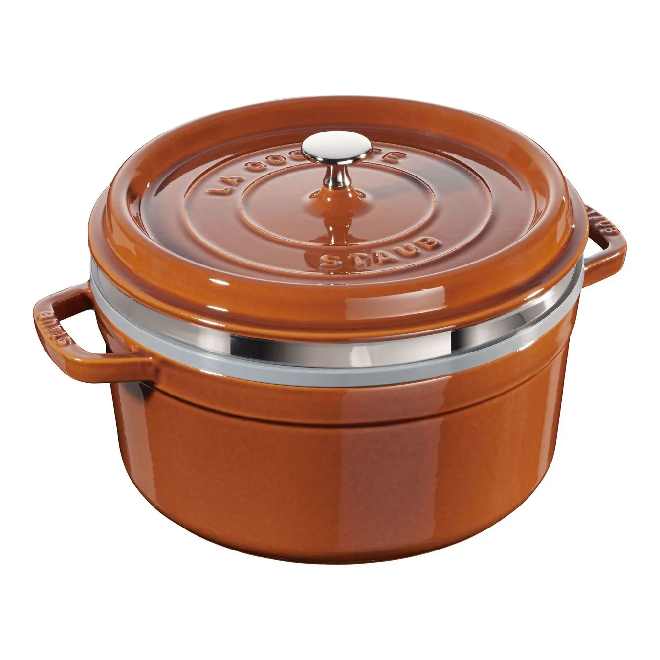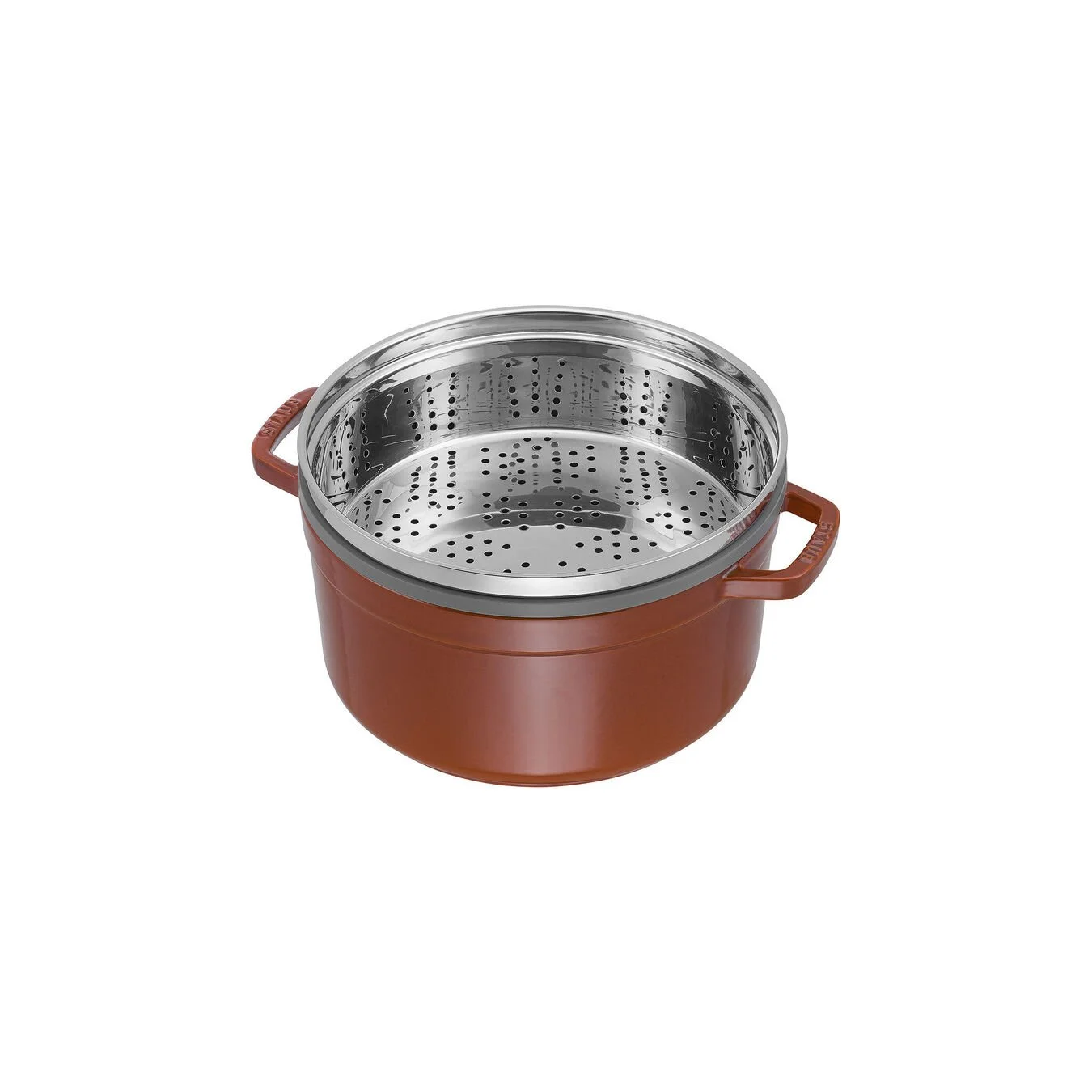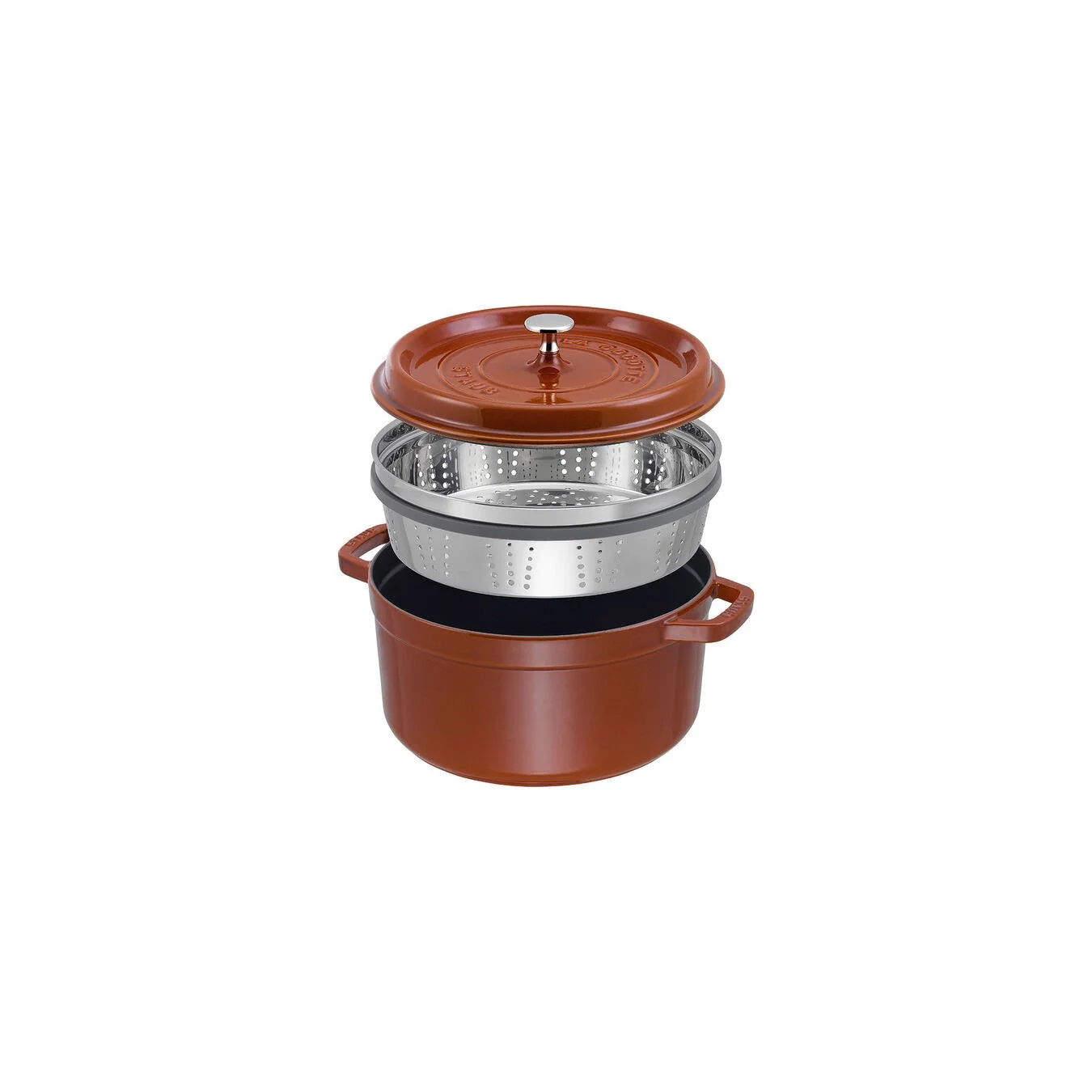 Dampindsatsen kombineret med en cocotte gør det muligt at braisere grøntsager og dampe fisk og ris på samme tid. Den kanelfarvede cocotte fra Staub tilføjer en multifunktionel gryde til dit køkkengrej og vil inspirere dig til nye madlavningskreationer.