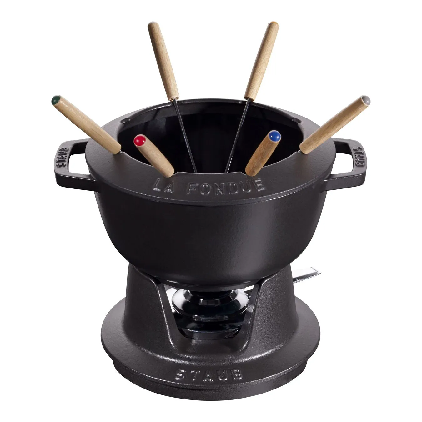 Fonduesæt i sort støbejern inkl. 6 fonduegafler. Kan bruges til bådes ost, kød og chokolade. Fonduen måler 20 cm i diameter.