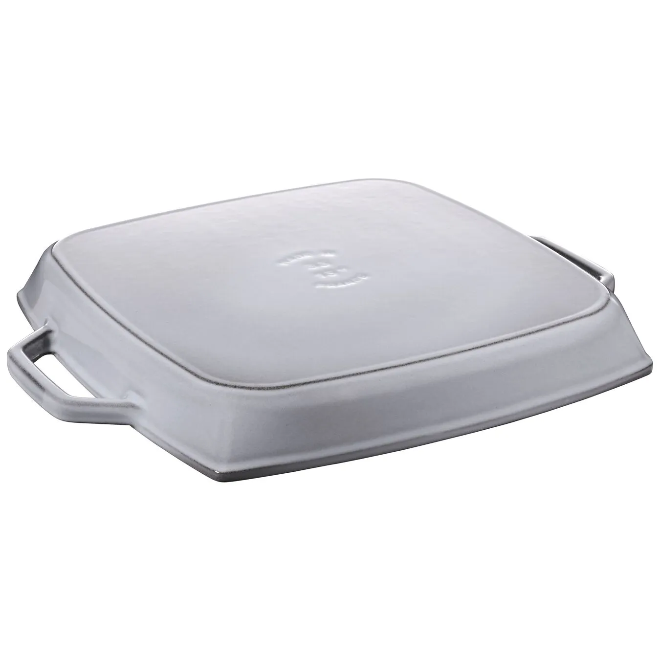 Grillpanden har to små håndtag på siderne, så den nemt kan bæres, vendes eller hældes. Den kvadratiske grillpande er egnet til alle typer komfur, inklusiv induktion, og har en samlet størrelse på 33 cm. Med denne kompakte og praktiske grillpande fra Staub kan du fuldende dit køkkengrej og tilberede autentisk grillede retter uden besværet ved en rigtig grill.