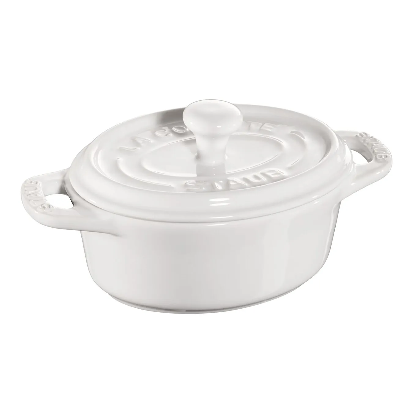 Denne hvide mini-cocotte kan indeholde 0,2 liter, hvilket gør den perfekt til små kager, og dens ovale form er let at stable med andre for pladsbesparende opbevaring i køkkenet.
