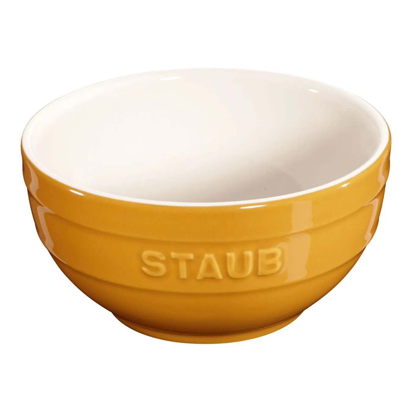 Den sennepsgule stentøjsskål fra Staub giver køkkenet et skønt strejf af farve. Skålen er egnet til servering af flere forskellige retter, inklusiv morgenmad, supper og pasta takket være dens størrelse på 14 cm.