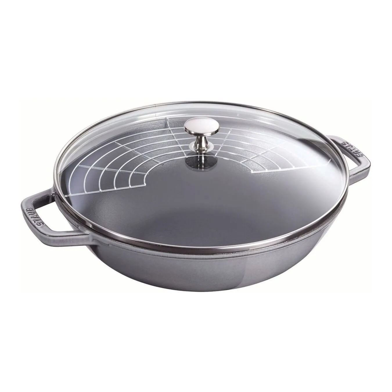 Køkkengrej i støbejern fra Staub kan bruges på enhver komfurtype, inklusiv induktion. To håndtag på wokkens sider gør det let at flytte den til ovnen for yderligere tilberedning eller blot at holde maden varm. Et glaslåg sparer vand og energi og giver et konstant udsyn til den stegende mad. Låget har en praktisk knop til at løfte det af og wokkens ridsefaste overflade kan klare ethvert røreredskab.