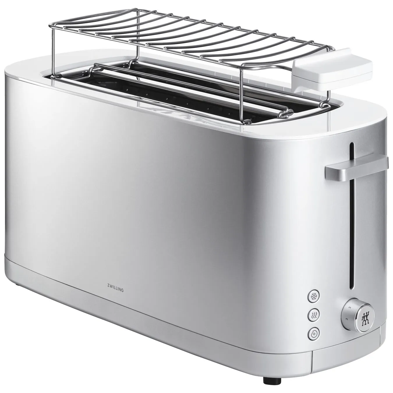 Denne højkvalitets ZWILLING brødrister med lang åbning til 4 skiver toast eller 2 lange skiver brød i et moderne design sikrer ensartet ristning. Skiverne bliver ristet jævnt på begge sider takket være de 4 separate varmeelementer på 1800 watt brødristeren. Færdigristede skiver flyver ikke ud af brødristeren – de glider. Soft-lift-funktionen sikrer, at brød og toastskiver hæves forsigtigt, og med den integrerede løftefunktion kan mindre skiver også løftes komfortabelt ud af brødristeren. Det er umuligt at brænde skiverne: brødristeren slukker automatisk efter den indstillede cyklus. Selv på den højeste indstilling bliver skiverne maksimalt mørkebrune. Hver proces kan straks afbrydes med stop-knappen. Krummer ender i den let aftagelige krummebakke. Med 7 ristningsniveauer og 3 automatiske programmer kan hver ristningsproces tilpasses dine behov. Med genopvarmningsfunktionen kan en skive, der er blevet kold, genopvarmes. Optøningsfunktionen tillader direkte ristning af frossen toast. Og bagelfunktionen med centrering af brødskiver muliggør ideelle resultater – ristet indvendigt og sprød udvendigt. Med den aftagelige rist kan 2 ekstra boller opvarmes eller ristes.