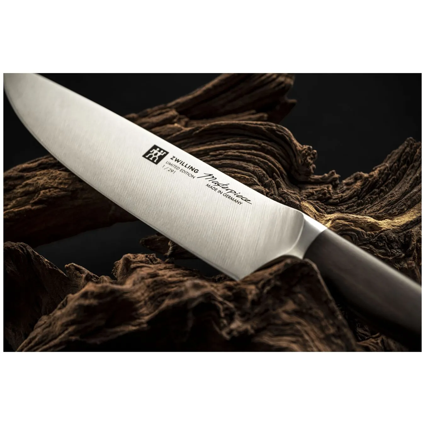 Men det er ikke kun vores lange historie, der er noget særligt: Med ZWILLING Masterpiece sætter vi også nye standarder inden for knive. Derfor fejrer vi en verdenspremiere med denne kniv: Det anvendte, højkvalitets X70 rustfrit stål er udviklet eksklusivt for ZWILLING og anvendes for første gang i denne unikke kokkekniv. Dette meget hårde stål med sin særligt fine karbidstruktur er blevet forfinet med en traditionel tre-trins skærpningsmetode i hånden for at give kniven dens ekstreme skarphed. På den måde kan du opnå fremragende resultater, når du skærer eller skærer, så du igen og igen kan opleve de helt særlige øjeblikke af kulinariske bedrifter i din køkkenhverdag. Håndtaget af håndpoleret palisander er ligeledes et mesterværk. Det ligger ergonomisk i hånden med perfekt balance for den ultimative skæreoplevelse, der føles ganske enkelt fantastisk hver gang du skærer. Masterpiece er designet i Milano af stjernedesignerne Matteo Thun & Antonio Rodriguez. Kniven er kronet med ZWILLING-logoet på bolsteret og er et unikt højdepunkt, som vil betage dig med sin ynde og elegance.
